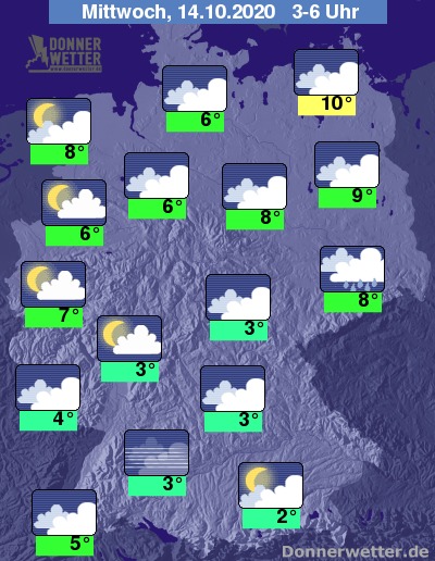 Bis zu den Frühstunden kühlt die Luft auf 5 bis 2 Grad im Süden, sowie 10 bis 6 Grad im Norden ab.