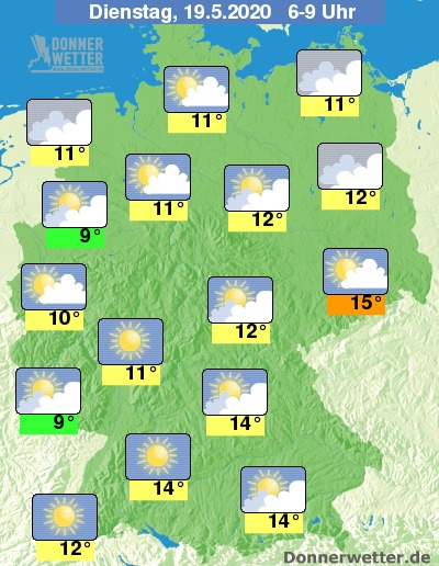 Die Temperaturen liegen bei Werten um 9 Grad im Saarland und um 15 Grad in der Lausitz.