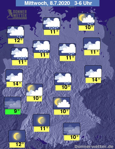 Während der zweiten Nachthälfte entfernt sich der Regen im Nordosten nach Polen. Der neue Regen von Westen kommt aber rasch ostwäts voran, breitet sich über den nördlichen Mittelgebirge sowie der Norddeutschen Tiefebene aus und kann auch intensiver ausfallen.