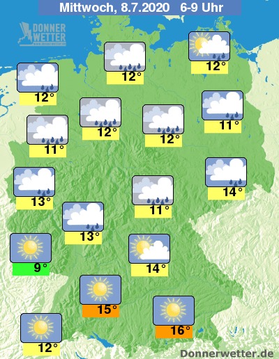 Die Wochenmitte startet über weiten Landesteilen verhangen und immer wieder fällt Regen, der regional auch kräftiger ausfallen kann. Freundlich und trocken in den neuen Tag geht es meist nur im äußersten Südwesten sowie südlich der Donau. Hier wird es mit Frühwerten um 15/16 Grad auch am wärmsten, sonst werden nur Werte um 9 bis 14 Grad erreicht.