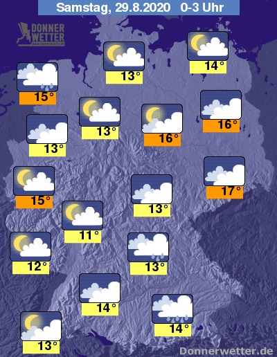In der Nacht bleibt der Himmel im Norden des Landes zunächst noch wechselnd oder stark bewölkt, bevor es in den frühen Morgenstunden von der Eifel bis in die Holsteinische Schweiz auch aufklaren kann. Temporäre Schauer sind meist nur im Umfeld der Küsten zu erwarten. Im Süden bleibt es bei einem meist bedecktem Himmel oder es ist aufgelockert bewölkt, über weiten Teilen Bayerns muss zudem mit Schauern gerechnet werden.