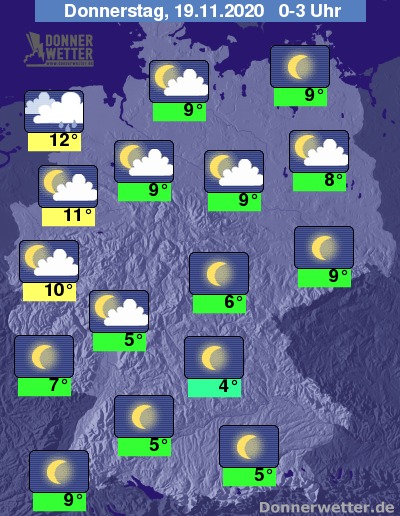 Bis zu den Frühstunden kühlt die Luft meist auf 9 bis 4 Grad ab, örtlich kann es im Süden leichten Bodenfrost geben. Im Westen und im Norden halten sich die Temperaturen noch im zweistelligen Bereich auf.