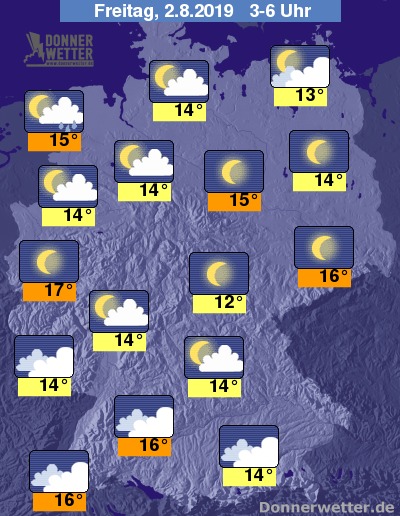 In der kommenden Nacht zeigt sich der Himmel im Osten meist klar. In den übrigen Bundesgebieten sind nur lockere bis aufgelockerte Wolkenfelder in der Nacht zu erwarten. Dazu bleibt es meist trocken. Lediglich im Ostfriesland kann es zu einzelnen Schauern kommen. Die Temperaturen fallen auf 15 Grad im Harz und 14 Grad im Bayerischem Wald.
