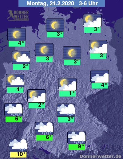 In der folgenden Nacht ziehen sich die dichten Regenwolken immer weiter in den Süden Deutschlands zurück, hier und da können auch einige Flocken dabei sein. Weiter nach Norden hin bleibt es trocken und es lockert bzw. klart verbreitet auf. Die Temperatur sinkt auf 10 Grad in Freiburg und bis etwa 1 Grad im Eichsfeld. Der Wind weht im Süden anfangs noch zum Teil stark bis stürmisch, nach Mitternacht lässt er jedoch auch hier deutlich nach.