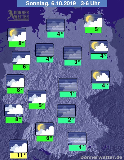 In der Nacht zum Sonntag ist es zunächst verbreitet locker bewölkt oder sternenklar, im Westen schon hier und da stärker bewölkt, aber trocken. Westlich des Rheins werden die Wolken bis zum Morgen immer kompakter und gegen Morgen ist auch Regen möglich, sonst bleibt es trocken. Die Temperatur sinkt auf 11 Grad in Freiburg und bis etwa 1 Grad im Vogtland.