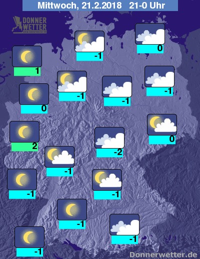 In den Abendstunden bleibt der Himmel zwischen Weser und Oder meist dicht bewölkt oder bedeckt, Schauer sind aber nicht zu erwarten. Zwischen Ostfriesland und dem Saarland ist der Himmel klar, im Südosten überwiegt lockere oder aufgelockerte Bewölkung.