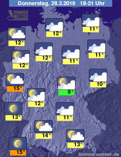Die Temperaturen liegen vor Dämmerungsbeginn zwischen 9 Grad in Thüringen und 15 Grad in den Ballungsgebieten des Westens, sowie am Kaiserstuhl.