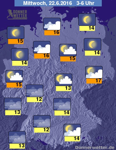 In der Nacht zum Mittwoch sind anfangs vom Westen bis in die Mitte noch einzelne Schauer oder etwas Regen möglich. Im Norden halten sich ebenfalls oft dichte Wolken, wobei es hier weitgehend trocken bleibt. Im übrigen Bundesgebiet ist es dagegen meist locker bis aufgelockert bewölkt, vor allem im Süden und Nordosten verbreitet auch sternenklar, dabei bleibt es trocken. Die Temperatur sinkt auf  17 Grad in Leipzig und auf etwa 12 Grad in Konstanz.