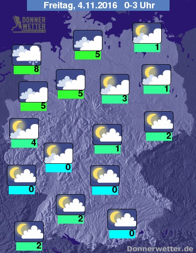 In der Nacht zu Freitag bleibt es in Nordseenähe nass. Gegen Süden klart es hingegen zunehmend auf. Unter bedecktem Himmel liegen die Tiefstwerte im Norden bei 8 Grad. Wo es aufklart, fallen die Temperaturen auf Werte um den Gefrierpunkt.