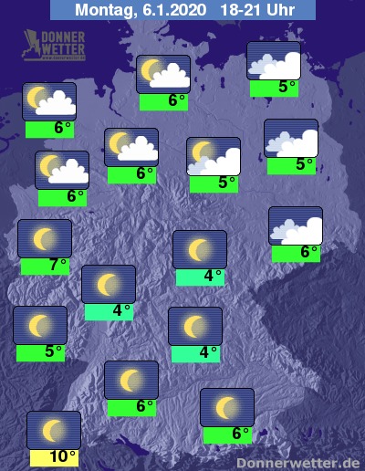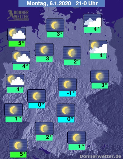 Die Temperaturen sinken bis zum späten Abend auf Werte um -1 Grad im Thüringer Wald und um 5 Grad an der Nordseeküste.