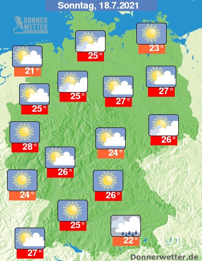 Am Sonntag fällt am Alpenrand vormittags unter dichten Wolken noch gebietsweise Regen, der etwa um die Mittagsstunden abklingt. Im übrigen Land ist es schon verbreitet heiter bis sonnig, im Norden ziehen gebietsweise mehr Wolken durch, jedoch bleibt es trocken. Die Temperatur steigt auf 21 Grad an der Nordsee und bis 28 Grad im Rheinland.