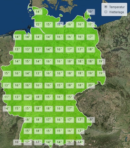 Die Temperaturen gehen dabei zurück auf Tiefstwerte zwischen 11 Grad in der Eifel und 20 Grad in Dresden.