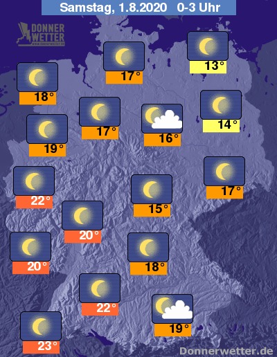 Die Tiefstwerte bewegen sich in der Nacht im Südwesten und Westen - hier vor allem in den Ballungszentren - auf Tropennacht-Nivau und sinken teils nur auf Werte um 23 bis 21 Grad ab. In den übrigen Landesteilen und besonders im Nordosten lässt es sich bei Werten um 19 bis 13 angenehmer schlafen.