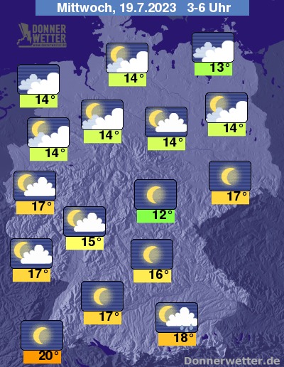In der folgenden Nacht ziehen im Umfeld von Nord- und Ostsee zunehmend dichte Wolken auf, die gegen Morgen auch gebietsweise Regen bringen. Im Südosten des Landes und an den Alpen sind einzelne Schauer möglich. Im übrigen Land ist der Himmel meist locker bewölkt oder sternenklar, dazu bleibt es trocken. Die Temperatur sinkt auf 20 Grad in Freiburg und etwa 12 Grad in Erfurt.
