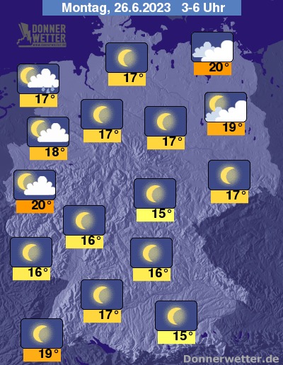 In der bevorstehenden Nacht ist es über Deutschland zum Großteil sternenklar und trocken. Einige und teilweise dichte Wolken ziehen über den Norden Deutschlands hinweg, dazu können sich auch einzelne Schauer bilden. Die Temperatur sinkt auf tropische 20 Grad in Rostock und bis 15 Grad in München.