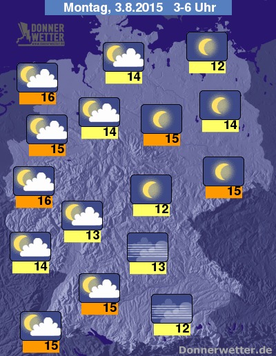 In der Nacht zum Montag bleibt es vor allem über der Osthälfte der Republik überwiegend sternenklar, weiter nach Westen hin ziehen meist nur lockere Wolken durch, dazu bleibt es landesweit trocken. Die Temperatur sinkt auf 16 Grad an der Nordseeküste und etwa 12 Grad im Coburger Land.