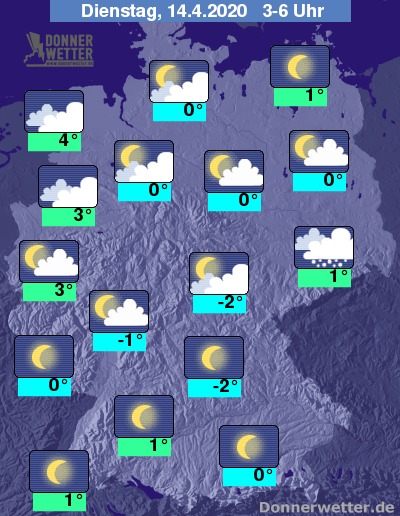 In der Nacht zum Dienstag zeigt sich der Himmel überwiegend sternenklar. Vom Nordwesten, über die Landesmitte bis nach Ostdeutschland ist es oft stark bewölkt, dazu fällt vom Thüringer Wald bis zum Erzgebirge gebietsweise auch Schnee oder Schneeregen, sonst bleibt es trocken. Die Temperatur sinkt auf 4 Grad an der Ems und bis auf -2 Grad in Oberfranken.