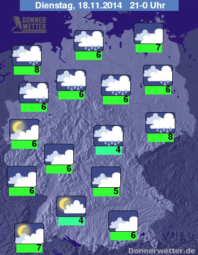 Heute Abend bleibt die Wolkendecke verbreitet geschlossen und es ziehen vielerorts dunkle Wolken durch, dabei sind die Niederschläge zum Teil langanhaltend. Weitgehend trocken bleibt es im Süden, Südwesten und Westen Deutschlands, hier kann es gelegentlich auch mal etwas auflockern. Die Abendtemperatur liegt bei 8 Grad an der Nordsee und etwa 4 Grad an der Schwäbischen Alb.
