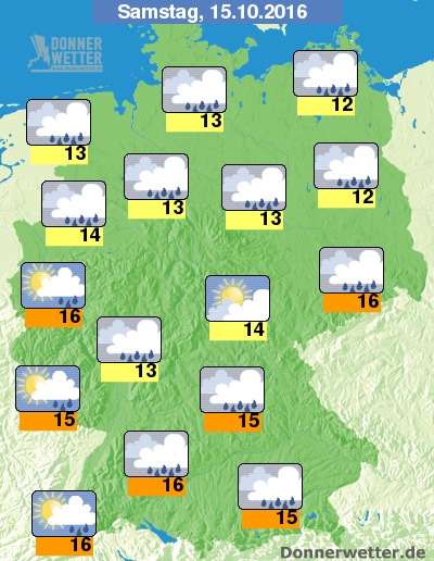 Am Samstag zieht verbreitet dichte Bewölkung übers Land hinweg, zudem ist immer wieder auch Regen möglich. Einige Aufheiterungen zeigen sich vor allem im Süden, Südwesten und Westen Deutschlands. Die Temperatur erreicht 12 bis 16 Grad.