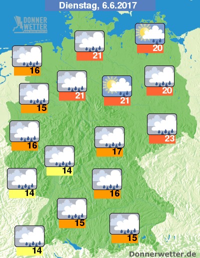Am Dienstag zieht ein kräftiger Tiefausläufer mit feuchtkühlen Luftmassen über Deutschland hinweg, dabei bleibt es überwiegend bei dichter Bewölkung und es bilden sich wiederholt Schauer. Örtlich sind Gewitter möglich bei Höchstwerten von 14 Grad am Pfälzer Wald und bis 23 Grad in Dresden.