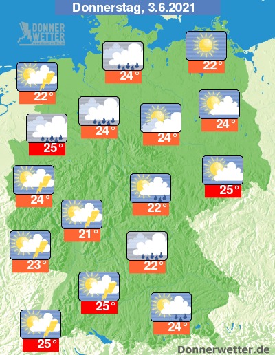 In der Süd- und Westhälfte ist der Himmel dagegen häufig stark bewölkt und es besteht ein erhöhtes Gewitterrisiko mit Unwetterpotential. Örtlich muss neben schweren Gewittern mit Starkregen, Hagel und stürmischen Böen / Sturmböen gerechnet werden.