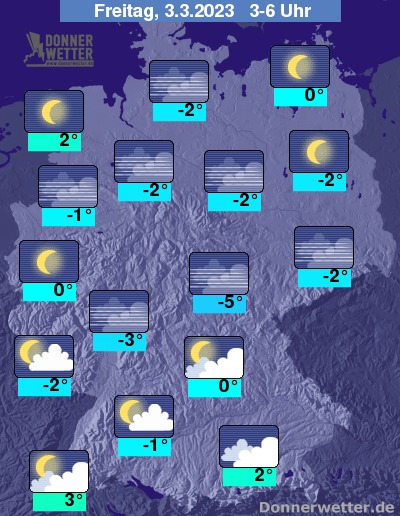 In der folgenden Nacht ist es südlich des Mains überwiegend trüb oder stark bewölkt, direkt an den Alpen sind auch ein paar Tropfen oder Flocken möglich. Im großes Rest des Landes ist der Himmel weitgehend sternenklar und es bleibt trocken. Die Temperatur sinkt auf 3 Grad in Freiburg und bis -5 Grad in Erfurt.