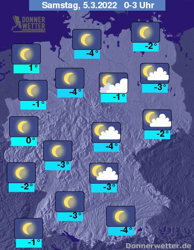 Die Temperaturen liegen in den Frühstunden bei Werten um -6 Grad im Thüringer Becken, -3 Grad an der Spree und um 0 Grad in Ostfriesland.