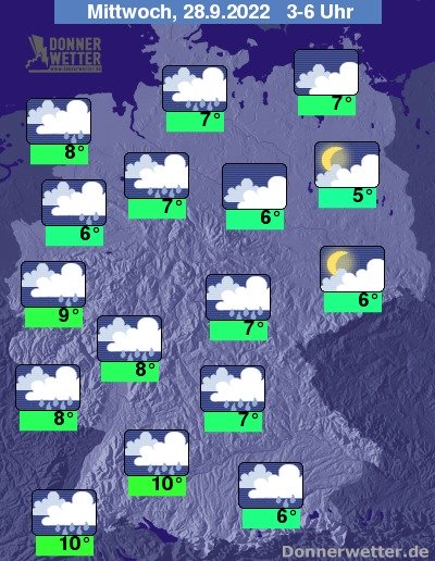 In der Nacht zum Mittwoch bringen dichte Wolken wiederholt Schauer, dazwischen kann es auch eine Zeit lang auflockern. Die Temperatur sinkt auf 10 Grad in Stuttgart und etwa 5 Grad in Potsdam.