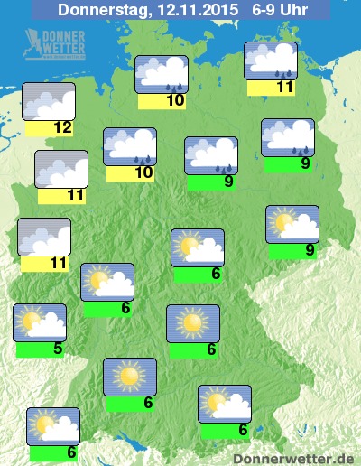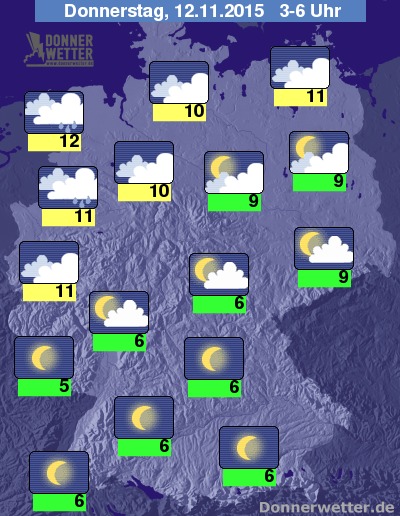 Die Temperaturen erreichen Werte um 5 Grad C im Pfälzer Wald und 12 Grad C in Emden.