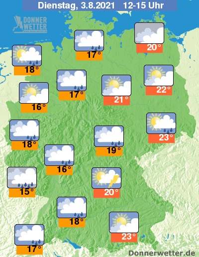 Heute Nachmittag ist es über der Bundesrepublik verbreitet stark und teils aufgelockert bewölkt, dabei bleibt es über dem Nordosten bis nach Brandenburg weitgehend trocken, sonst bilden sich vielerorts Schauer und auch mögliche Gewitter. Die Temperatur liegt bei 15 Grad am Pfälzer Wald und bis 23 Grad in der Lausitz.