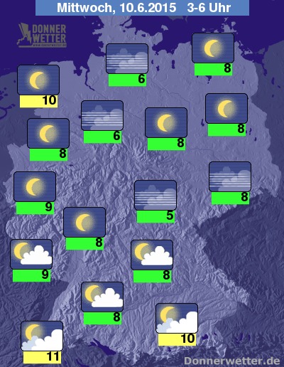 Im weiteren Nachtverlauf klart der Himmel weiter auf, entlang der Weser sowie in den Höhenlagen des Thüringer Walds und Erzgebirges kann sich örtlich auch Nebel bilden. Im Süden überweigt zumeist lockere Bewölkung.