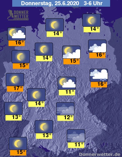 Während der zweiten Nachthälfte wechseln sich im Norden und Osten Wolken und Sterne miteinander ab, im Bereich des Erzgebirges sind die Wolken auch dichter und zeitweise kann etwas Regen fallen. Im Südwesten und Westen bleibt es oft sternenklar. An der Donau kann sich stellenweise Nebel bilden.