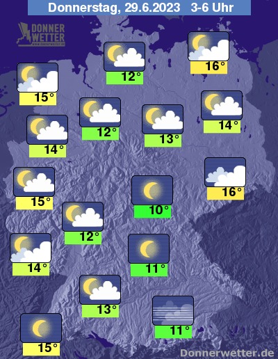 In der folgenden Nacht ist der Himmel überwiegend locker bis aufgelockert bewölkt. Im Süden und äußeren Osten auch größtenteils sternenklar. Mehr und teilweise dichte Wolken ziehen im Verlauf westlich von Rhein und Ems auf, dazu bleibt es aber trocken. Die Temperatur sinkt auf 16 Grad in Dresden und 10 Grad in Jena.