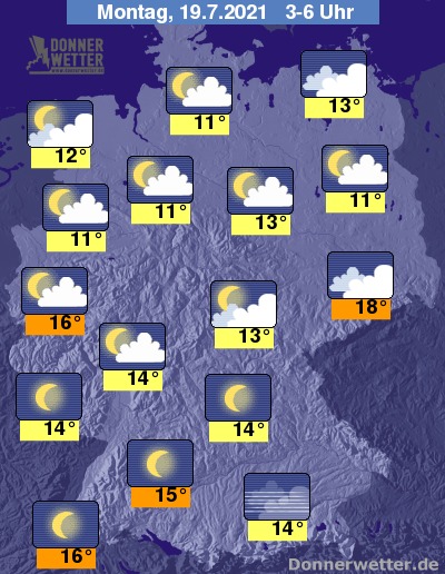 In der bevorstehenden Nacht ist der Himmel im Süden weitgehend sternenklar, sonst ist es teils sternenklar, teils locker bis aufgelockert bewölkt. Im Norden nimmt die Bewölkung zum Morgen hin etwas zu, dazu bleibt es aber trocken. Die Temperatur sinkt auf 18 Grad in Dresden und bis 11 Grad in Emmerich.