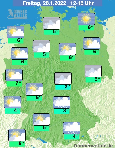Heute Nachmittag scheint im Nordosten des Landes verbreitet die Sonne. Im übrigen Land ist es weitgehend stark bewölkt oder bedeckt, hier und da kann sich aber auch vorübergehend mal die Sonne blicken lassen. Über Bayern können sich lokale Schneeschauer bilden, sonst bleibt es trocken. Die Temperatur liegt bei 2 Grad im Grabfeld und bis 7 Grad im Rheinland.