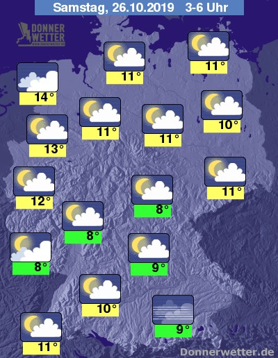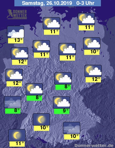 In der Nacht auf Samstag ist der Himmel meist locker bewölkt. Nur im Nordseeküstenumfeld ist es auch bedeckt, an den Alpen sowie im Pfälzer Wald kann sich auch Nebel bilden. Schauer sind in der Nacht nicht zu erwarten.