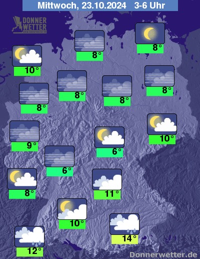 In der Nacht zum Mittwoch bringen dichte Wolken im äußeren Süden gebietsweise Schauer, auch im übrigen Süden bleibt es eher stark bewölkt, wenn auch meist trocken. Im Rest der Republik ist der Himmel hingegen meist sternenklar oder nur locker bewölkt, dazu bleibt es trocken. Die Temperatur sinkt auf 14 Grad in München und bis 6 Grad in Jena.