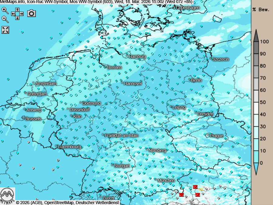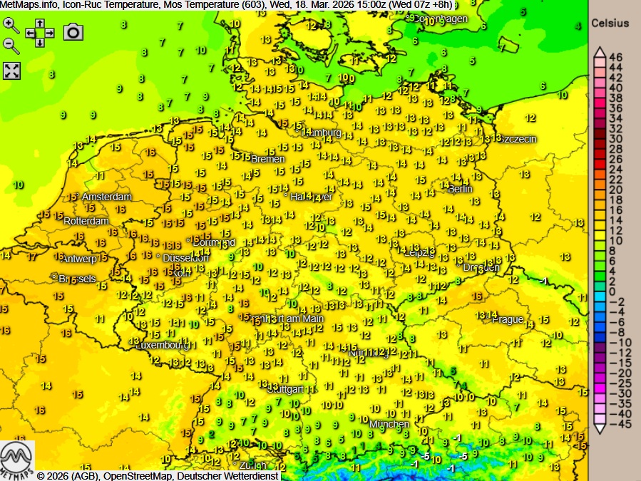 Die Temperatur- und Wetterkarte nach ICON-RUC für Mittwochnachmittag (15:00 Uhr):