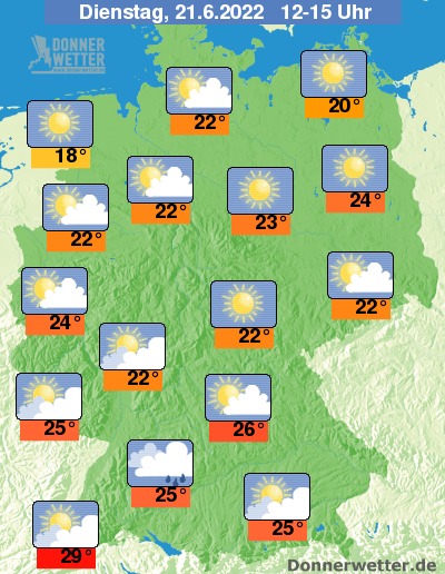 Heute Nachmittag ist es größtenteils heiter oder sonnig. Im Süden ziehen jedoch zum Teil auch dichtere Wolken durch, dabei sind vereinzelte Schauer möglich, sonst bleibt es aber trocken. Die Temperatur liegt bei 18 Grad an der Nordsee und bis 29 Grad im Breisgau.