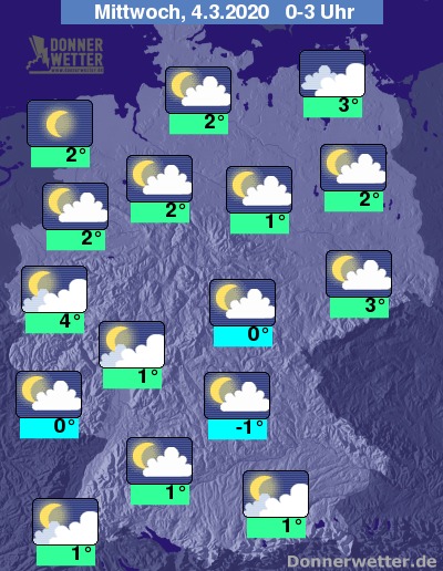 In den frühen Morgenstunden verdichten sich die Wolken vielerorts, einen freien Blick in die Sterne gibt es vereinzelt noch in der Osthälfte sowie an der Nordseeküste. Im Westen setzen erste Regen-, Schneeregen- oder Schneeschauer ein.