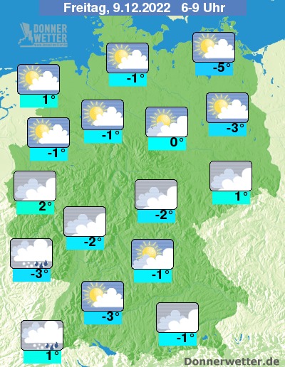 Der Freitag startet in der Nordhälfte mit einem Mix aus Sonne und Wolken, im Süden ist der Himmel zumeist stark bewölkt oder es ist bedeckt. Im Südwesten muss mit einzelnen Regen-, Schneeregen- oder Schneeschauern gerechnet werden, sonst bleibt es meist trocken.