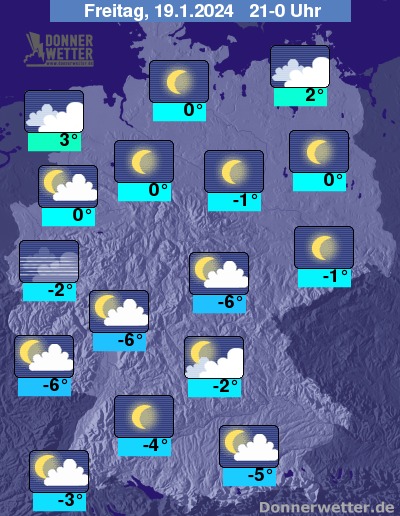 In der Nacht auf Samstag zeigt der Himmel über der Nordhälfte häufig stark bewölkt, im äußersten Norden und Nordosten sind auch noch einzelne Schauer möglich. In den übrigen Landesteilen bleibt es bei geringer Bewölkung oder es ist sternenklar, in den Niederungen können sich gebietsweise Nebel- oder Hochnebelfelder bilden.