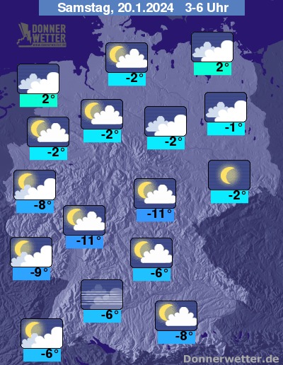 Die Temperaturen gehen auf Tiefstwerte um 2 Grad in Küstennähe zurück, sonst leichter bis mäßiger Frost bei -1 bis -11 Grad.