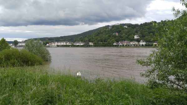Unsere Bilder zeigen den hohen Rheinpegel gestern bei Rheinkilometer 645 mit Blick auf Königswinter. Die Pegel vieler Flüsse, vor allem im Süden und Westen Deutschlands, werden zumindest auch in den nächsten 48 Stunden weiter steigen.