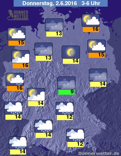 In der Nacht zum Donnerstag bleibt der Himmel über Süddeutschland weitgehend bedeckt und es fällt zum Teil langanhaltender Regen. Über der breiten Landesmitte sind anfangs noch vereinzelte Schauer und Gewitter möglich, im Nachtverlauf lockert die Bewölkung hier jedoch, wie schon zuvor auch im Norden Deutschlands verbreitet auf, dazu bleibt es trocken. Die Temperatur sinkt auf 16 Grad am Niederrhein und bis 9 Grad im Vogtland.