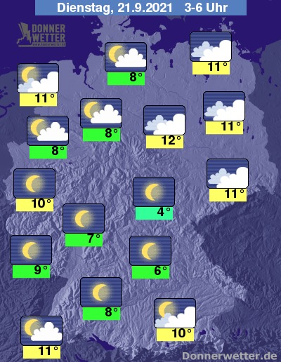 In der kommenden Nacht halten sich über dem Nordosten und Osten des Landes weitgehend dichte Wolken. Im Norden und Südosten ist es meist aufgelockert und im übrigen Land meist nur gering bewölkt oder sternenklar. An der Ostsee sind vereinzelte Schauer möglich, sonst bleibt es aber landesweit trocken. Die Temperatur sinkt auf 12 Grad in Magdeburg und bis 4 Grad in Jena.