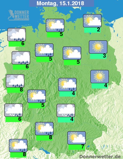 Zum Start in die neue Woche scheint vor allem über der Südosthälfte anfangs noch häufig die Sonne. Von Westen und Nordwesten breitet sich jedoch dichte Wolken und nachfolgend Regen aus, der bis zum Abend etwa einen Streifen vom westlichen Mecklenburg-Vorpommern bis ins nördliche Bayern erreicht. Östlich davon bleibt es noch trocken. Die Temperatur erreicht 2 bis 8 Grad. An Nord- und Ostsee weht ein oft stürmischer Wind. Vor allem an der Nordsee herrscht auch zum Teil Sturm.