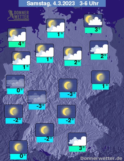 In der Nacht zum Samstag zieht sich der Himmel über dem Norden Deutschlands oft zu oder es ist noch aufgelockert bewölkt, dazu bleibt es weitgehend trocken. Im übrigen Bundesgebiet ist es verbreitet sternenklar, an den Alpen auch zum Teil stärker bewölkt, jedoch trocken. Die Temperatur sinkt auf 4 Grad in Cuxhaven und -3 Grad in Jena.
