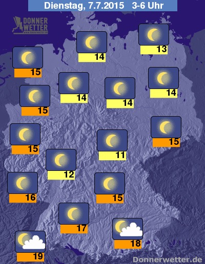 In der kommenden Nacht leuchten in Deutschland verbreitet die Sterne von einem weitgehend wolkenfreien Himmel. In Alpennähe können jedoch hier und da ein paar Wolken durchziehen, dazu bleibt es trocken. Die Temperatur sinkt auf 19 Grad im Oberrheingraben und bis etwa 11 Grad im Vogtland.
