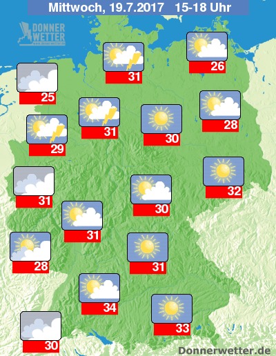 Höchstwerte um 33 Grad C - hier besteht heute die größte Unwettergefahr!